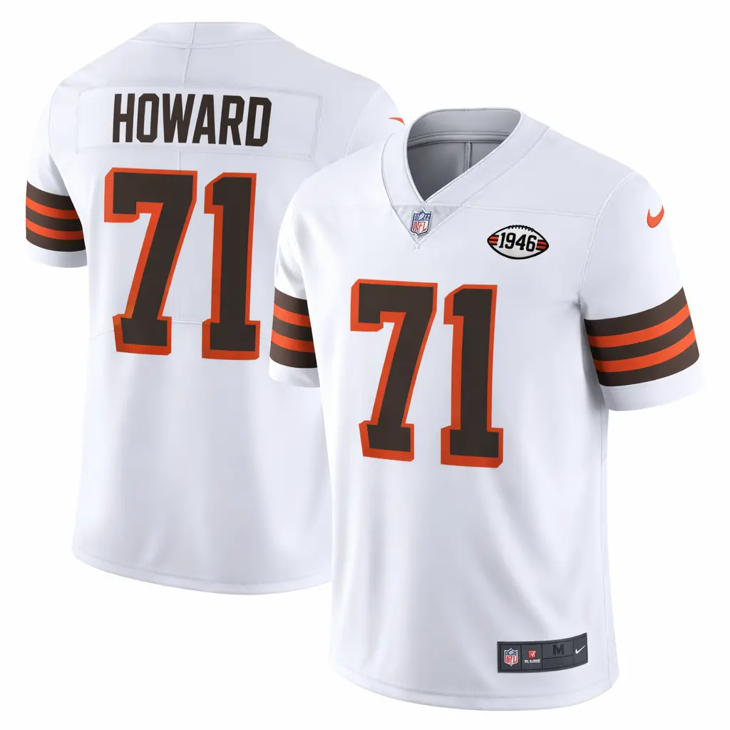 Honor the legacy of Cleveland football with this premium Tytus Howard 1946 Patch White Jersey. This meticulously crafted piece features a clean white colorway accented by vintage-inspired details and the iconic commemorative 1946 patch on the chest. Built for durability and style, the jersey boasts fully stitched name and numbers for an elevated look and feel. The breathable performance fabric ensures comfort whether you are cheering from the stands or wearing it casually. With its classic design and high-quality embroidery, this jersey is the perfect way to represent your team and celebrate decades of gridiron history in style.