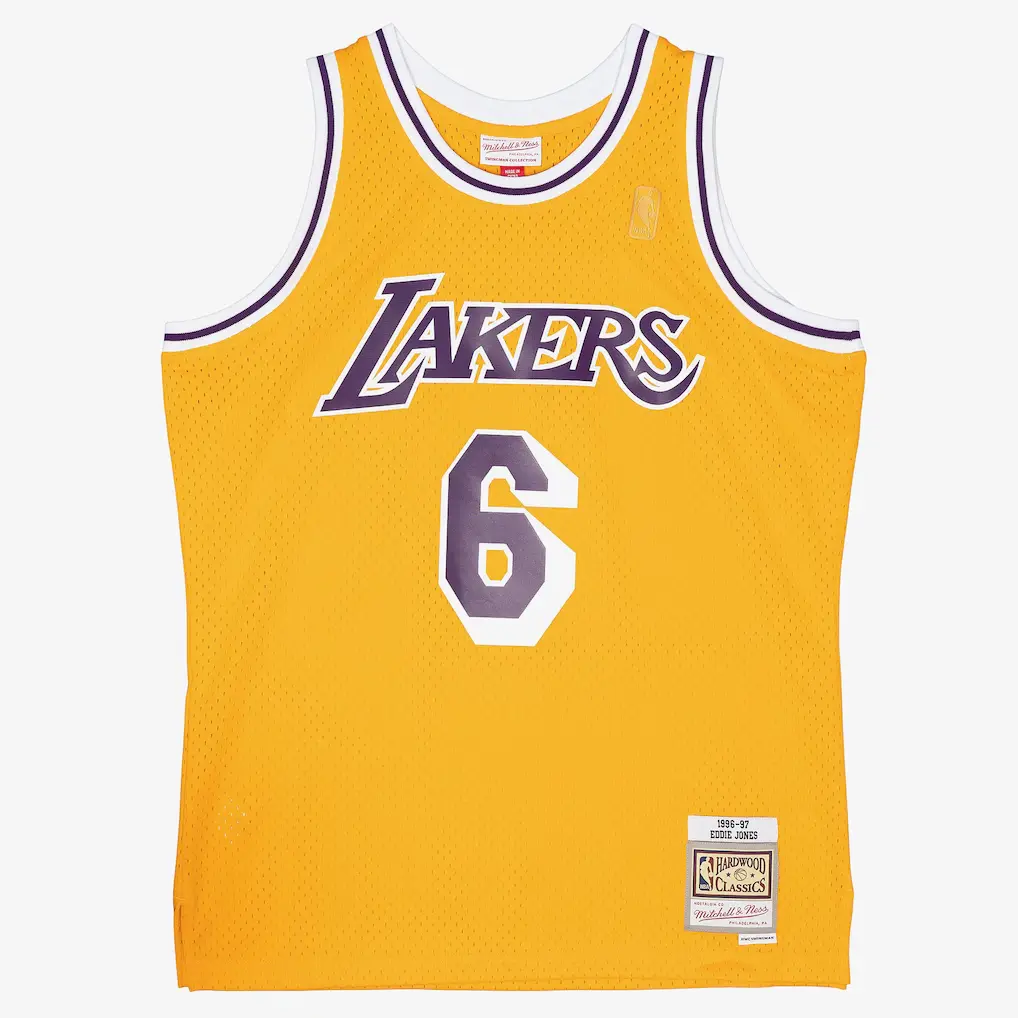 Relive a golden era of basketball history with this Eddie Jones Los Angeles Lakers jersey from the legendary 1996-97 season. This Hardwood Classics piece captures the vibrant gold aesthetic that defined the Lakers’ dominance on the court. Featuring premium stitched lettering and numbers, the garment offers a high-quality, durable finish that honors the legacy of one of the game’s most versatile guards. The breathable mesh fabric ensures maximum comfort whether you are at the arena or on the streets. Pay tribute to a classic decade of purple and gold greatness with this timeless, detailed vintage-style jersey.
