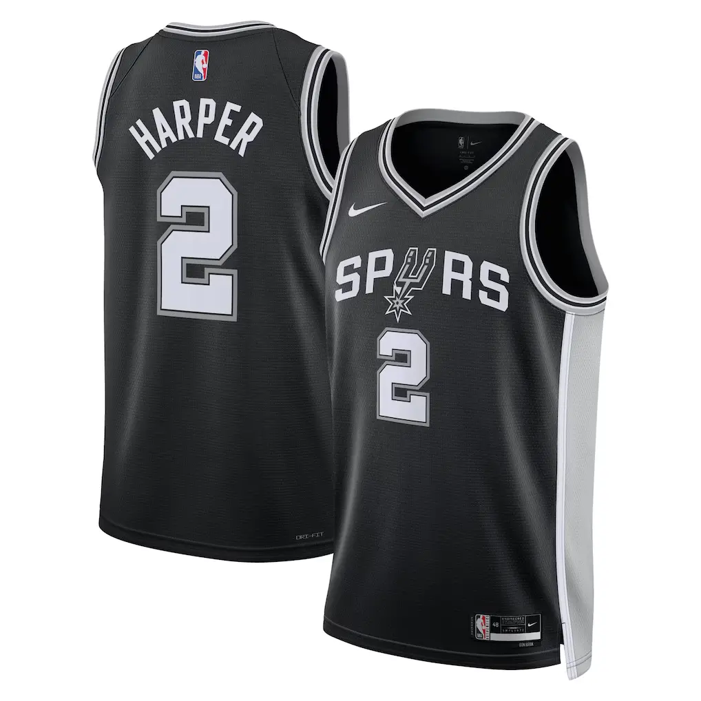 Represent the next generation of basketball excellence with this premium Dylan Harper black game jersey. Engineered for dedicated fans of the San Antonio silver and black, this garment features high-quality twill stitching for the player name and iconic number 2025. The breathable, moisture-wicking fabric ensures comfort whether you are cheering from the stands or playing on the court. Detailed with reinforced seams and professional athletic ribbing, this jersey captures the classic aesthetic of the professional hardwood. Celebrate the arrival of a top-tier talent with a durable, meticulously crafted piece of fan gear designed to last for seasons to come.