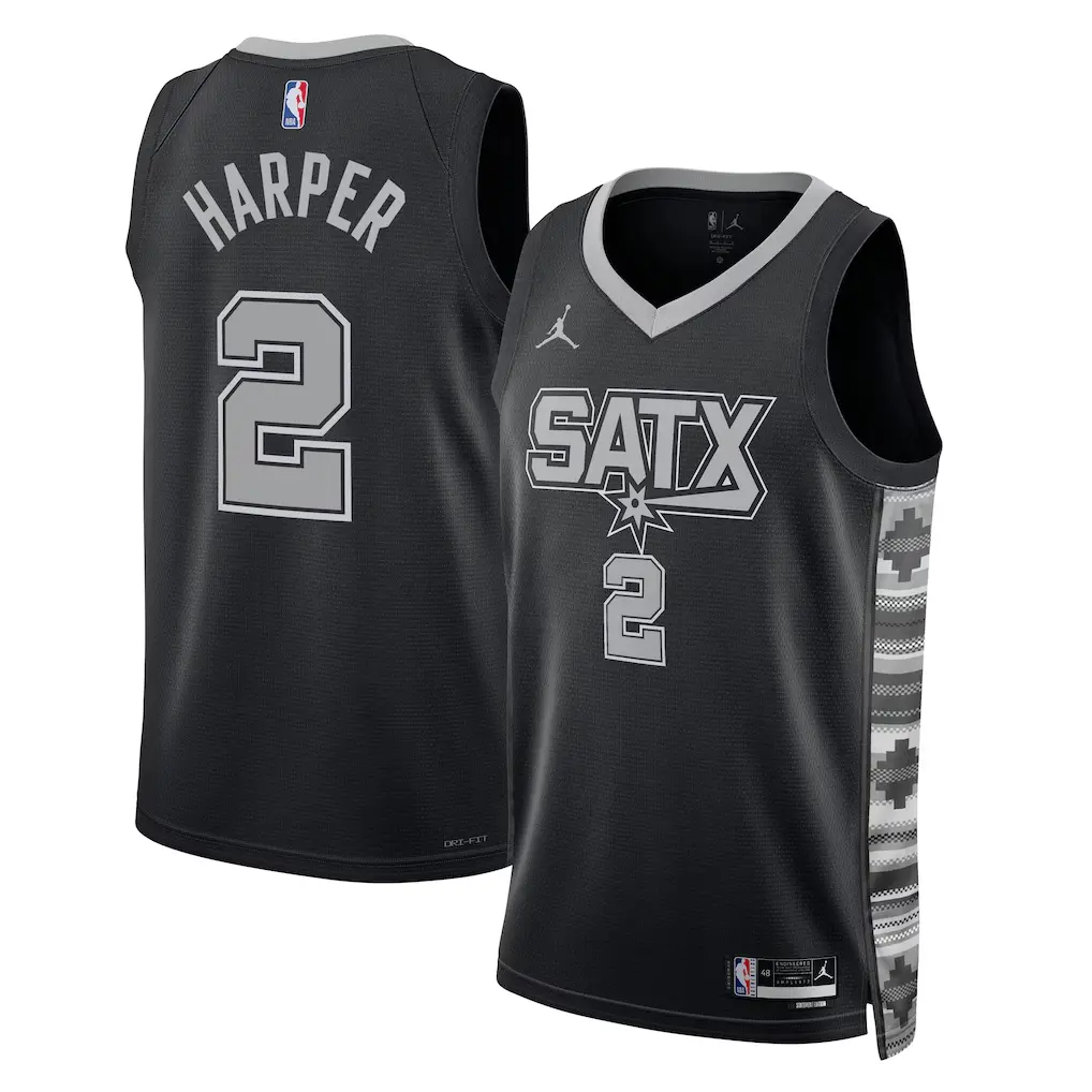 Represent the future of San Antonio basketball with this premium Dylan Harper Statement Edition jersey. Featuring a sleek black base with bold silver and white accents, this piece captures the modern intensity of the team’s visual identity. The jersey is meticulously crafted with high-quality, breathable mesh fabric designed for maximum comfort and durability whether you are on the court or in the stands. Every detail, from the player’s name to his iconic number, is professionally stitched to ensure a classic, long-lasting finish. With a tailored athletic fit and heritage-inspired design, this jersey is the ultimate way to support the newest star in South Texas.
