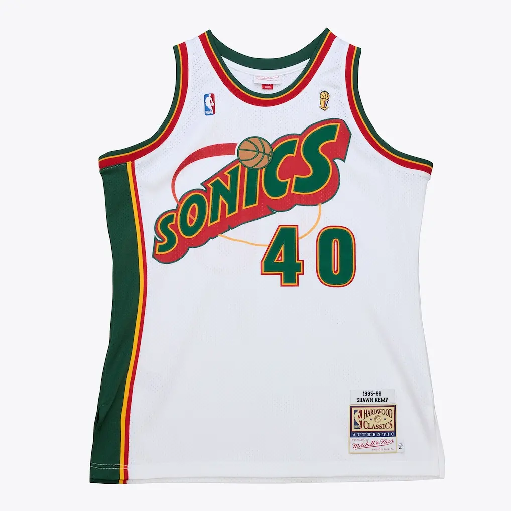 Elevate your basketball collection with this premium Shawn Kemp 1995-96 Seattle SuperSonics jersey. Capturing the peak of the Reign Man era, this classic white home uniform features high-quality stitched lettering and numbering for a durable, professional look. The iconic green and yellow arched chest text and collar trim recreate the legendary aesthetic of the mid-90s Western Conference champions. Crafted from breathable, high-performance mesh fabric, this piece ensures comfort whether you are hitting the court or styling a vintage streetwear outfit. Celebrate a golden age of hoops history with this meticulously detailed tribute to one of the most explosive power forwards to ever play the game.